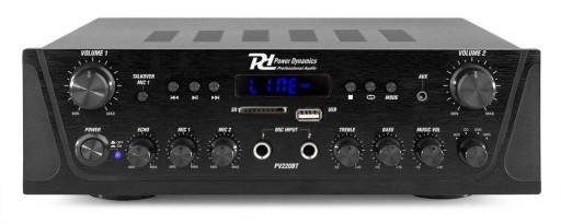 WZMACNIACZ STEREO O MOCY 100W Z NIEZALEŻNĄ REGULACJĄ GŁOŚNOŚCI NA 2 STREFY, WYŚWIETLACZEM LCD, PEŁNĄ REGULACJĄ BARWY DŹWIĘKU ORAZ MIKROFONÓW W TYM ECHA, TUNEREM RADIOWYM, BLUETOOTHEM, WEJŚCIEM USB I SD DO ODTWARZANIA MUZYKI ORAZ Z WEJŚCIAMI NA PODŁĄCZENIE NP. KOMPUTERA, WIEŻY, TELEFONU, TELEWIZORA ITP.