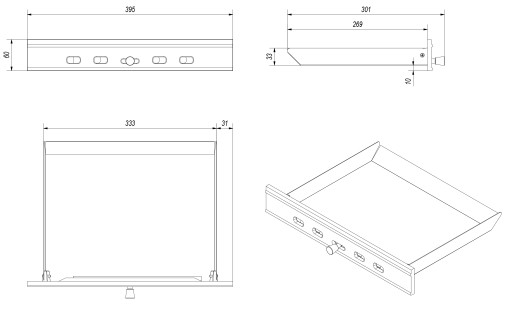 Uniwersalna szuflada popielnika do wkładu kominkowego Felix o wymiarach: długość: 23 cm, szerokość: 30 cm, wysokość: 3,5 cm.