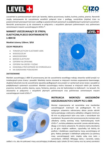 Mankiet uszczelniający L+B04 SE przeznaczony jest do uszczelnienia wszelkiego rodzaju otworów wokół przejść rur instalacyjnych przez ściany i posadzki. Mankiety można stosować w miejscach montażu wyposażenia basenowego, słupków balustrad oraz do uszczelniania wpustów podłogowych oraz przejść rur sanitarnych przez ściany i posadzki w podpłytkowych systemach uszczelnień. Mankiet uszczelniający można stosować w miejscach takich jak: łazienki, prysznice, kuchnie, pralnie, baseny, sauny, fontanny, piwnice, oraz do hydroizolacji na balkonach i na tarasach. Do stosowania w połączeniu z wszystkimi płynnymi polimerowymi oraz polimerowo cementowymi masami uszczelniającymi marki LEVEL+®.