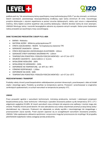 UWAGA: Wklejając taśmy i narożniki, należy zadbać o to, aby nie pokrywać masą uszczelniającą środkowej części (około 20 mm) taśmy oraz tej samej szerokości podłoża pod nią. Tak zamontowaną taśmę szpachlujemy masą hydroizolacyjną LEVEL+® po obu stronach, w minimum dwóch warstwach, pozostawiając niezaszpachlowaną środkową część taśmy (minimum 20 mm). Uszczelniając przejścia dylatacyjne z użyciem wypełnienia w postaci sznurów dylatacyjnych, należy użyć sznura o odpowiedniej średnicy, który będzie szczelnie wypełniać całą szczelinę dylatacyjną i idealnie dociskać taśmę do ścian wewnątrz. UWAGA! Montując taśmy i narożniki bezwzględnie zabrania się używania ostrych narzędzi. Dalsze prace budowlane należy prowadzić po wyschnięciu masy uszczelniającej.