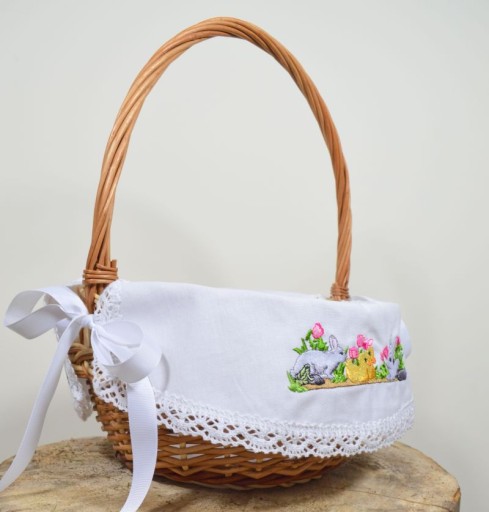 Przedstawiamy WIĄZANĄ, uniwersalną serwetkę do koszyczka Wielkanocnego zdobioną bawełnianą koronką, wykonaną w naszej pracowni. Urocze hafty dodadzą koszyczkowi niepowtarzalnego charakteru. Wiązania wykonane z białej tasiemki.