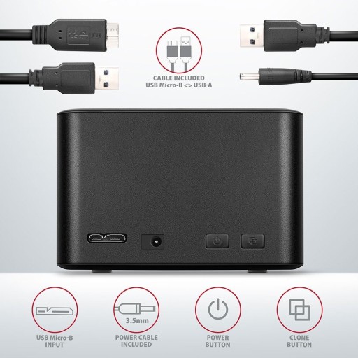 Stacja dokująca / klonująca SuperSpeed USB 5 Gbps AXAGON ADSA-D25 CLONE MINI łatwo i szybko podłączyć do komputera dwa dyski 2.5" jednocześnie. Podłączenie do komputera umożliwia złącze USB Micro-B w stacji dokującej wraz z dostarczonym kablem USB Micro-B USB-A.