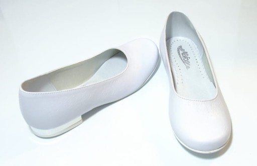 Białe baleriny dziewczęce wykonane ze skóry ekologicznej, środek ze skóry naturalnej. Na białym, niskim obcasie z wstawką w kolorze srebrnym. Gładkie, klasyczne baleriny bez zdobień.