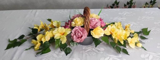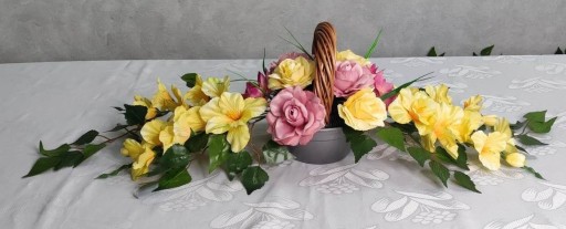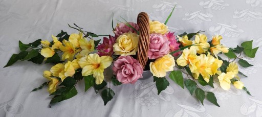 Wiązanka nagrobna wykonana ręcznie z wysokiej jakości sztucznych kwiatów w donicy zalanej betonem.