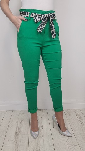 Piękne włoskie spodnie typu cygaretki, nogawka podwijana z możliwością odwinięcia. Bardzo dobra jakość 65 % wiskozy, w talii elastyczna gumeczka, spodnie mają kieszenie po bokach tył gładki.