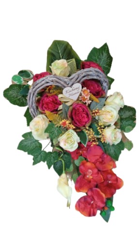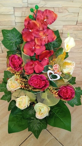 Kompozycja sztuczna (tzw. stroik, ikebana) jest wykonana z sztucznej choiny ZABETENOWANEJ w PIĘKNEJ OSŁOŃCE Z WINOROŚLI co daje jej stabilność.