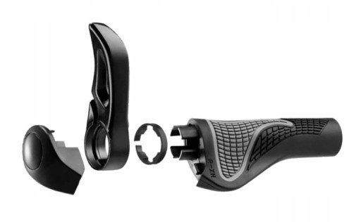 Dla lepszej przyczepności do kierownicy oraz możliwości regulowania każdy chwyt składaj się z 4 części. Rączka, aluminiowy pierścień, róg i ze strony zewnętrznej zaślepka. Wytrzymałe zaślepki dodatkowo przytrzymują rączki na kierownicy blokując równocześnie dostawanie się brudu do środka.