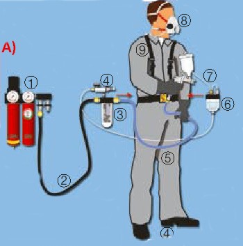 A) Oczyszczone powietrze przepływa z filtra np. SATA 0/444 (1) do reduktora umieszczonego na pasku (3) , następnie oczyszczane jest przy pomocy filtra z węglem aktywnym a dalej doprowadzane poprzez wężyk (7), bezpośrednio do maski. (8). Można zastosować wąż powietrzny (5) łączący reduktor z pistoletem lakierniczym .