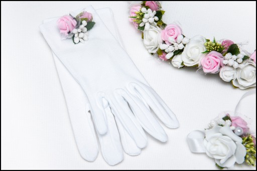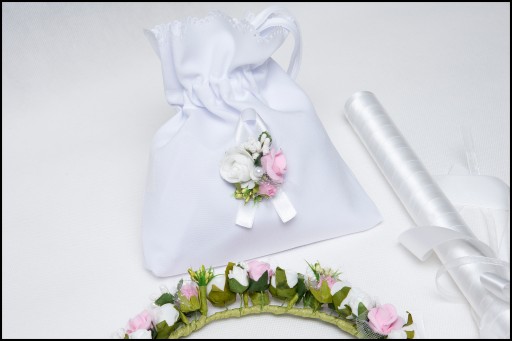 Efektowny zestaw do Komunii składający się z 5 produktów, jednakowa kolorystyka oraz zdobienia - całośc tworzy idealne uzupełnienie stroju komunijnego