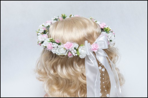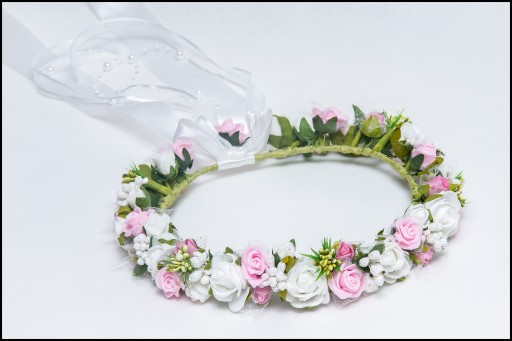 Wianek wykonany w rozmiarze standardowym 51 cm, elastyczny stelaż idealnie dopasowuje się do głowy dziecka