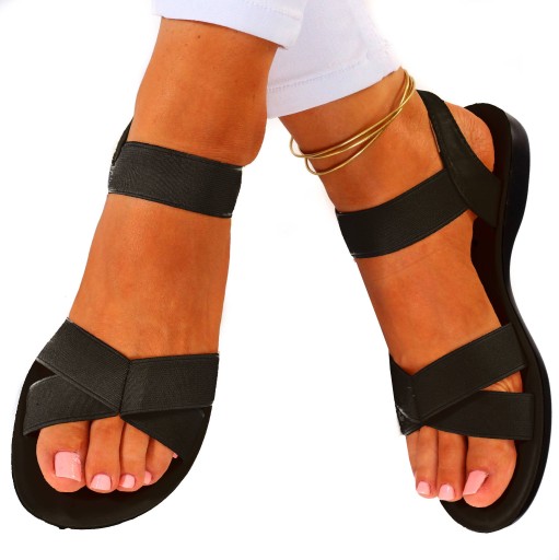 Damskie sandały w kolorze czarnym z elastycznymi paskami na płaskiej podeszwie. Prosty fason sprawia, że idealnie sprawdzą się jako obuwie codzienne w letnie, upalne dni oraz z łatwością dopasują się do bardziej oficjalnych stylizacji. Posiadają rozciągliwy pasek z gumy do łatwego nakładania oraz dopasowania do różnych tęgości stopy. Profilowana wkładka zapewnia komfort użytkowania.