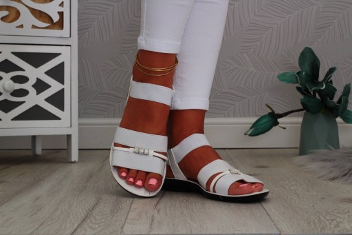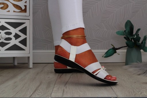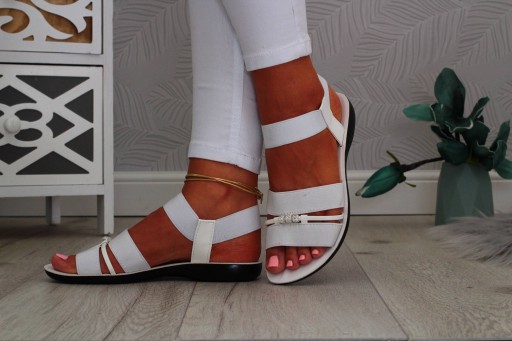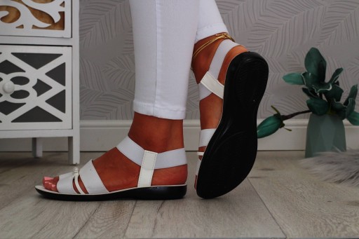 Damskie sandały w kolorze białym z elastycznymi paskami na płaskiej podeszwie. Prosty fason sprawia, że idealnie sprawdzą się jako obuwie codzienne w letnie, upalne dni oraz z łatwością dopasują się do bardziej oficjalnych stylizacji. Rozciągliwy pasek z gumy przy kostce ułatwia nakładanie oraz dopasowanie obuwia do różnych tęgości stopy. Profilowana wkładka zapewnia komfort użytkowania.