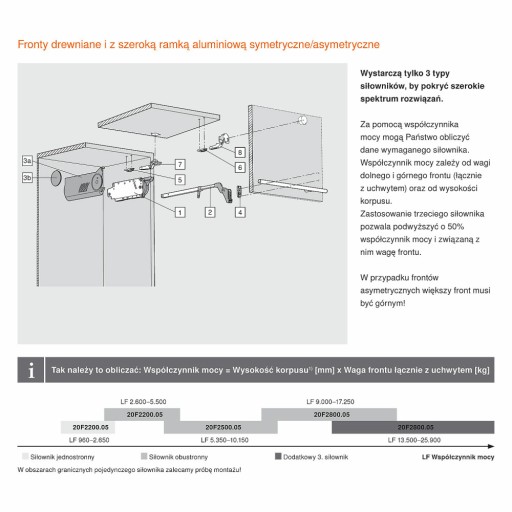 Wysokość korpusu KH (mm) x waga dolnego i górnego frontu (FG) łącznie z uchwytem (kg). W przypadku spornych, granicznych danych zalecamy silniejszy siłownik!