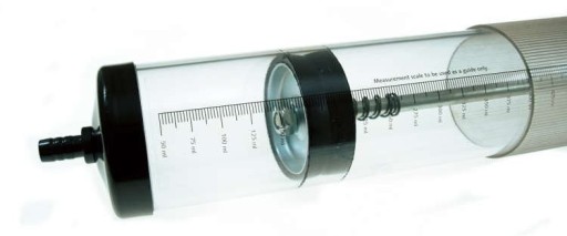 Pompka nie posiada skali pokazanej na zdjęciu. Przezroczysta obudowa pozwala sprawdzić jakość cieczy i ilość zanieczyszczeń bez potrzeby przelewania płynu do innego pojemnika. Na górze strzykawki znajduje się antypoślizgowa powierzchnia ułatwiająca trzymanie pompy.