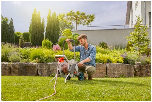 Wózek na wąż GARDENA CleverRoll M Easy Metal - zestaw jest wyjątkowo solidną konstrukcją, która sprosta nawet najcięższym warunkom w ogrodzie. Wózek umożliwia wygodne i oszczędzające miejsce przechowywanie węża ogrodowego. Do nawijania węża na bęben służy ergonomiczna, plastikowa korba z miękkimi elementami, a równomierne nawijanie węża na bęben zapewnia solidna prowadnica. Składana stopa wózka zapewnia wysoką stabilność. Specjalny kształt i wysokie położenie kół dodatkowo pomagają utrzymać wózek w pozycji stojącej. Składana podstawa, opuszczana rączka i składana korba dbają o to, by po złożeniu produkt zajmował jak najmniej miejsca. Zestaw jest gotowy do użycia, zawiera 25 m węża Comfort Flex 13 mm (1/2"), złączki GARDENA oraz zraszacz prosty.