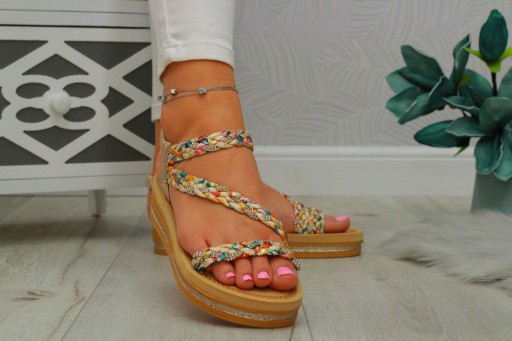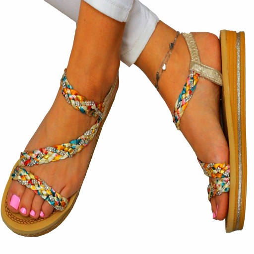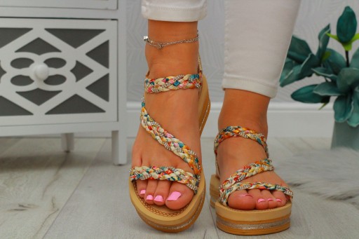 Plecione, wielokolorowe damskie sandały z elastycznymi paskami na płaskiej podeszwie. Prosty fason sprawia, że idealnie sprawdzą się jako obuwie codzienne w letnie, upalne dni. Rozciągliwy pasek z gumy przy kostce ułatwia nakładanie oraz dopasowanie obuwia do różnych tęgości stopy.