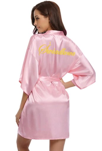 Niezwykle kobiecy szlafrok. Wykonany z delikatnej i przyjemnej w dotyku satyny poliestrowej, która nie prześwituje. Szlafrok można zawiązać od środka na zakładkę za pomocą cienkiego sznureczka, dzięki czemu nie będzie się rozsuwał. Dodatkowo z zewnątrz szlafrok wiązany jest za pomocą szerokiego paska. Plecy szlafroka zdobi efektowny haftowany napis "Świadkowa".