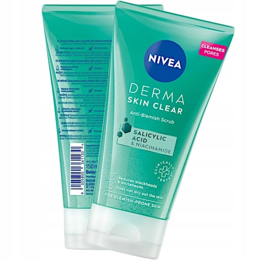 NIVEA Derma Skin Clear Peeling przeciw niedoskonałościom to wyjątkowa formuła wzbogacona Kwasem Salicylowym oraz Niacynamidem. Produkt przeznaczony do twarzy i ciała, dla skóry skłonnej do niedoskonałości. Peeling widocznie redukuje wągry i zaskórniki, jednocześnie dokładnie oczyszcza pory.