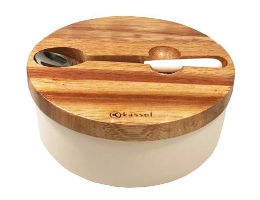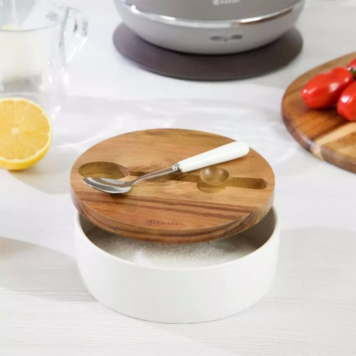 Porcelanowa cukiernica w kolorze białym z pokrywą wykonaną z drewna akacjowego. W zestawie łyżeczka z porcelanową rękojeścią.