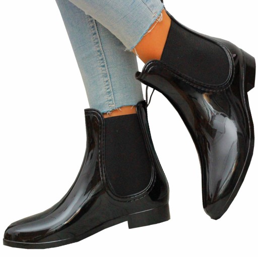 Lakierowane, damskie gumowce, sztyblety w kolorze czarnym. Posiadają wstawkę z elastycznej gumy. Łatwe w zakładaniu- wsuwane. Klasyczny fason sprawia, że buty pasują do wielu stylizacji. Idealne na deszczową pogodę lub do ogrodu. Płaska podeszwa dobrze amortyzuje stopę.