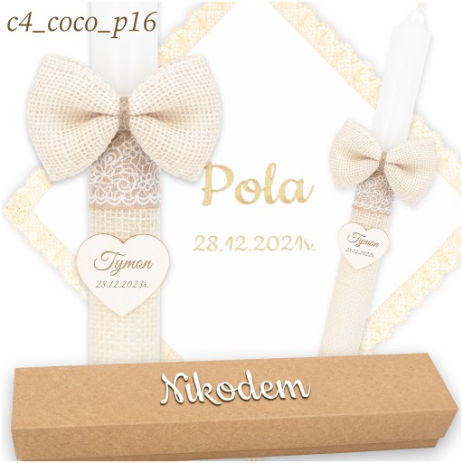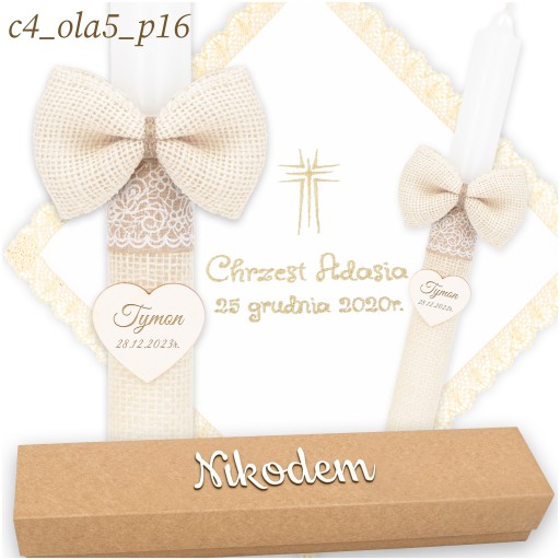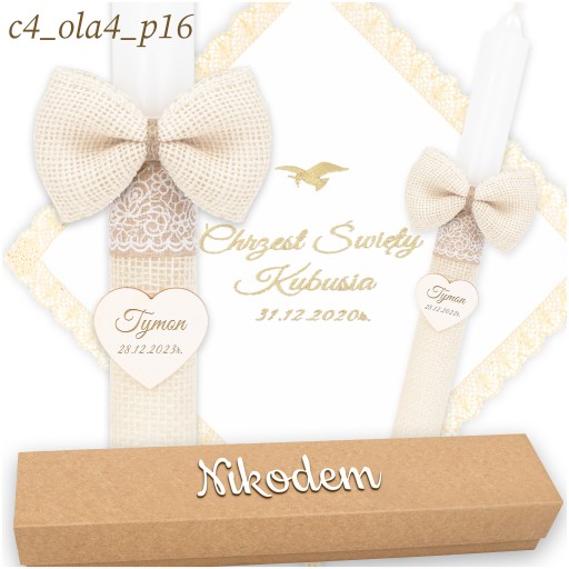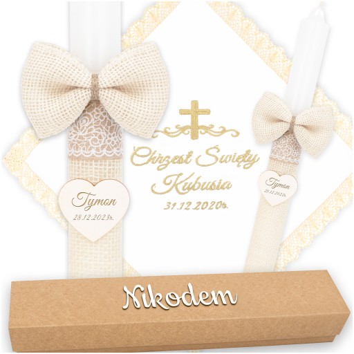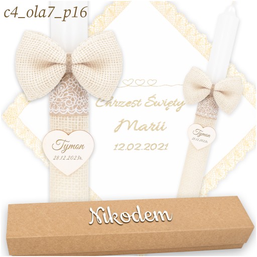Świeca na chrzest jest owinięta delikatnym materiałem jutowym, co nadaje jej rustykalny, boho charakter. Ozdobiona jest opaskami, które podkreślają jej wyjątkowy styl. Co więcej, do świecy przymocowana jest urocza jutowa kokarda oraz zawieszka w kształcie serca, na której możemy dla Ciebie wygrawerować imię i datę chrztu, aby uczynić tę pamiątkę jeszcze bardziej osobistą.