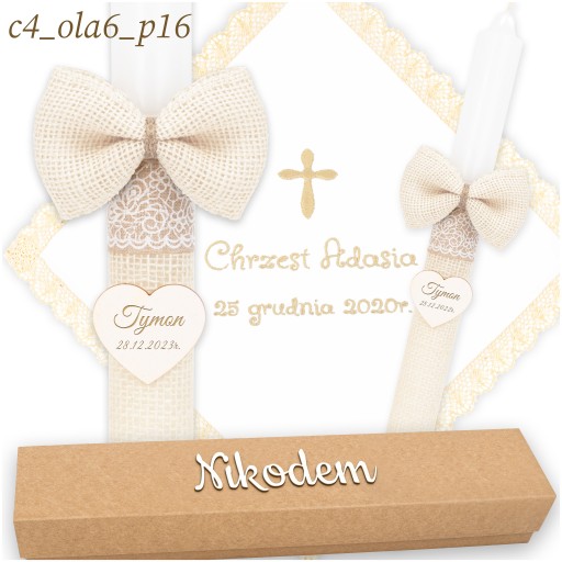 ŚWIECA NA CHRZEST BIAŁA SZATKA I ŚWIECA DO CHRZTU PUDEŁKO Z IMIENIEM *HAFT*