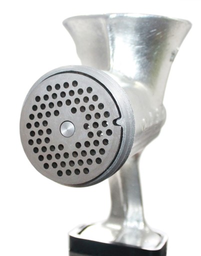 Solidna maszynka do mięsa " ALFA" polskiego producenta. Najważniejszą częścią maszynki jest doskonale dopasowana ślimacznica, która wprawiona w powolny ruch obrotowy (napędzana ręcznie - korbką) przesuwa kawałki mięsa w kierunku obracających się wraz ze ślimacznicą noży rozdrabniających mięso przeciskane przez tarczę z niewielkimi otworkami o ostrych krawędziach.