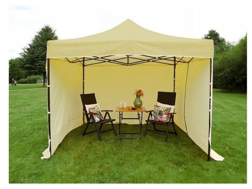 Składany pawilon ma teleskopowe nogi o regulowanej wysokości, które osiągają wysokość boczną ok. 2,30 m na najwyższym poziomie.