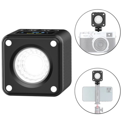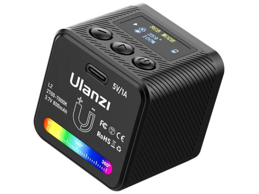Lampa LED ULANZI L2 RGB ma również prostą ścieżkę, co umożliwia wdrożenie oświetlenia do różnych sytuacji. Jasność 200 LUX (1 m) i 750 LUX (0,5 m). Wbudowany wyświetlacz OLED sygnalizuje poziom naładowania baterii i wybrany tryb pracy. Dostosowany jest także do aktualnych ustawień użytkownika, temperatury barwowej i RGB.