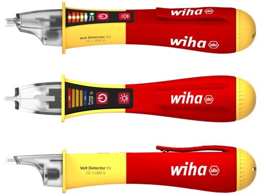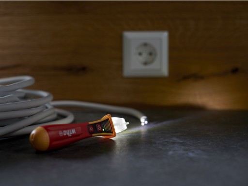 - Pierwsze wskazanie, czy nie ma napięcia, jest możliwe przy użyciu bezdotykowego próbnika napięcia Wiha dzięki sygnałowi optycznemu i akustycznemu.