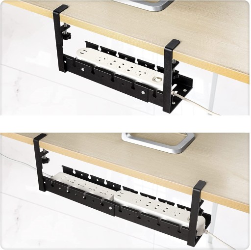 Wielofunkcyjny organizer, w postaci regulowanego kosza / prowadnicy montowanej pod blatem biurka, doskonale sprawdza się w przechowywaniu listwy zasilającej i uporządkowaniu biegu kabli i przewodów w domu, biurze czy w magazynie.