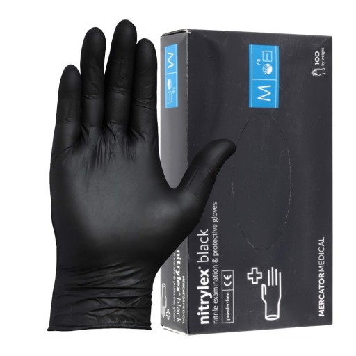 Rękawice nitrylowe czarne M Mercator 100szt. Jednorazowe rękawice ochronne nitrylowe, diagnostyczne. Cechuje je duża elastyczność, zapewniająca lepsze czucie i dopasowanie do dłoni. Wyrodukowane są w całości z syntetycznego nitrylu. Mają wysoką wytrzymałość mechaniczną, ograniczają ryzyko alergii, mają zwiększoną wrażliwość dotykową. Dopuszczone do styczności z żywnością zgodnie z wymogami przepisów Unii Europejskiej. Gwarantują dobrą barierę ochronną przed wirusami. Uniwersalny kształt pasujący na lewą i prawą dłoń. Cena za 100 szt. w pudełku.