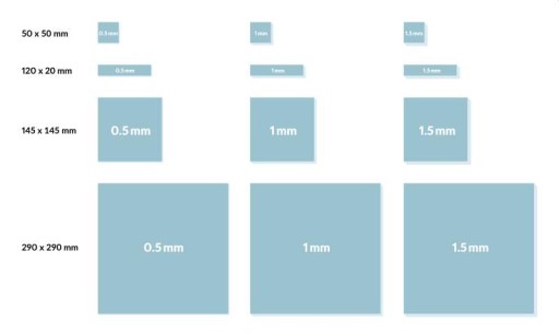 Podkładki termiczne ARCTIC są dostępne w grubościach 0,5 mm, 1,0 mm i 1,5 mm o różnych rozmiarach. Dzięki temu bez problemu dopasujesz sobie najbardziej odpowiedni rozmiar.