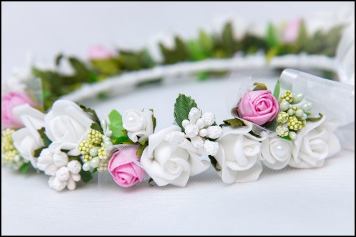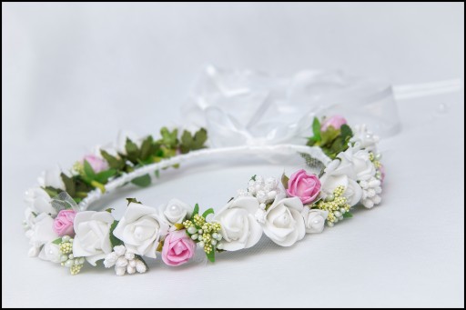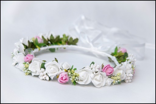 Przedmiotem oferty jest piękny wianek komunijny wykonany ręcznie z kwiatów piankowych oraz dodatków florystycznych.