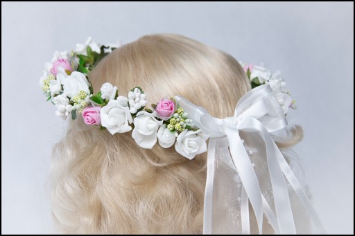 Realistyczny wygląd kwiatów, dodatków oraz wykończenie atłasową kokardą nadają delikatnego i eleganckiego wyglądu dziewczynce w tym ważnym dniu.