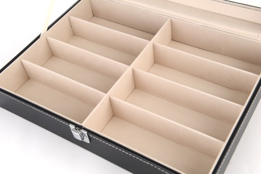 Solidne, eleganckie pudełko na okulary 8 sztuk Wykończone eko skórą. Można w nim przechowywać do 8 par okularów a także inne drobiazgi np. biżuterię.