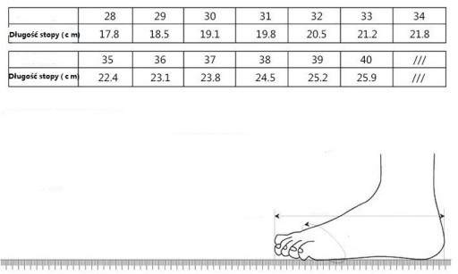- jeśli tył stopy jest wysoki, a kształt stopy jest szeroki i gruby, zaleca się wybrać jeden rozmiar większy, jeśli tył stopy jest płaski, a kształt stopy jest szczupły. Zaleca się wybór mniejszego rozmiaru.