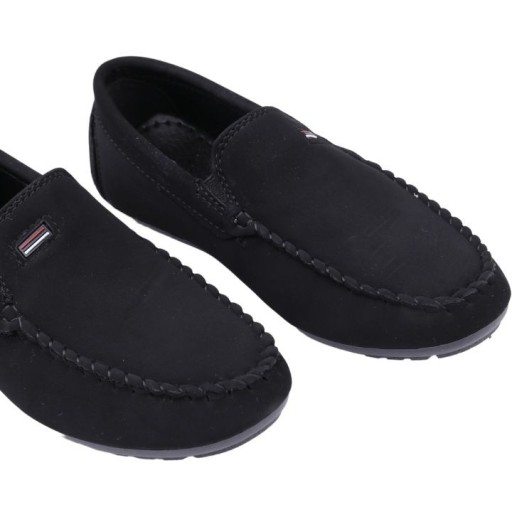 Mokasyny chłopięce, osadzone na płaskiej podeszwie z protektorem. Cholewka niska ozdobiona przeszyciami. Model wsuwany, wykonany z ekozamszu. Wkładka skórzana. Wyglądają dobrze w zestawieniu z eleganckimi spodniami jak również z modnymi chinosami.
