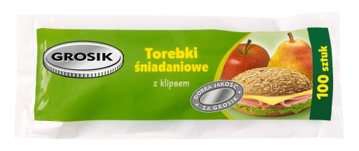Torebki do przechowywania żywności marki Grosik, można w nich trzymać np. kanapki śniadaniowe, owoce i warzywa. Idealnie sprawdzą się też podczas mrożenia: mięs, ryb, owoców i warzyw. Wykonane są z foli przeznaczonej do żywności, wymiary to 17 x 24 cm, a opakowanie zawiera 100 sztuk. Folia nie przepuszcza zapachów.