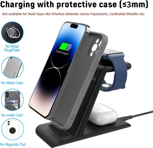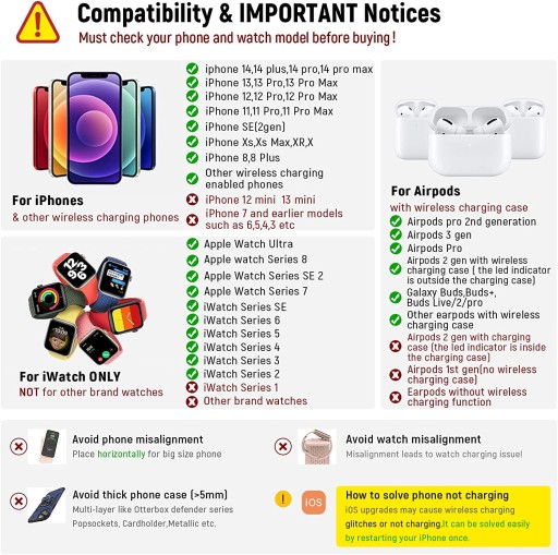 Bezprzewodowa stacja ładująca 3 w 1 z certyfikatem QI: Obsługuje szybkie ładowanie zegarka Apple iPhone i Airpods w tym samym czasie, kompatybilna z Apple iPhone 14 / iPhone 14 plus / iPhone 14 pro / iPhone 14 pro max / 13 Pro Max / 13 Pro / 13/12/ 12 Pro /12 Pro Max / SE 2gen / XR /X /XS/ XS Max / 11 pro Max /pro/11/ 8 plus /8, Apple Watch iWatch Ultra / 8 / 7 / 6 / 5 / 4 /3/2/ SE, Airpods pro 2 / pro / 2 / 1 i Samsung Galaxy Buds series/Z Flip/S20 Ultra/S20+/S10+/S10e/Note10/Note10+ i inne telefony obsługujące Qi. (QC3.0 Adapter jest w zestawie). Nie dla iphone 12/13 mini, nie dla iphone 13/12 ładowarka magsafe, UWAGA: iPhone 14 Pro musi być ładowany poziomo, ponieważ moduł obiektywu jest zbyt duży