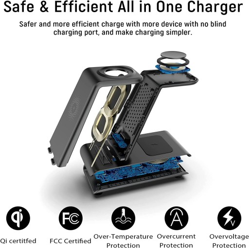 Wydajność i inteligencja: Standard z certyfikatem Qi: regulacja ładowania bezprzewodowego WPC Qi 1.2.4, inteligentna konstrukcja 4-cewkowa z ładowaniem dopasowanym, inteligentna ładowarka Apple Watch/iphone/airpods zgodnie z różnymi wymaganiami dotyczącymi zasilania urządzeń i znacznie zwiększa urządzenia wysokowydajne ładowanie bezprzewodowe z prędkością do 1,7 A i niskie zużycie energii w trybie czuwania, bezpiecznie utrzymują baterię. Działa z bezprzewodową ładowarką wewnątrz obudowy telefonu/zegarka.