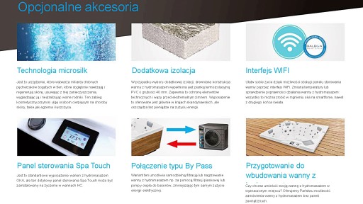 Wanny z hydromasażem wyposażone są w pompę cyrkulacyjną oraz system grzałek Balboa. Za dodatkową opłatą możemy wyposażyć jacuzzi w moduł Wi-Fi i połączyć jacuzzi z Twoim smartfonem. Można również zamówić pakiet hydroterapii MicroSilk, który regeneruje i oczyszcza skórę.