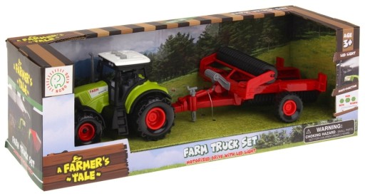 Traktor z napędem frykcyjnym na tylną oś, efektami dźwiękowymi i świetlnymi oraz odczepianą przyczepą. Efekty dźwiękowe sprzyjające zabawce, odpowiadają dźwiękom trąbienia, odpalanego silnika oraz cofania. Za efekty świetlne odpowiadają światła zamontowane z przodu, pod dachem pojazdu, mrygają podczas włączonego dźwięku. Jeden z bronów, dokładnie jest to wał pierścieniowy, którego dwa tylnie wały rozkładają się, aby dokładnie i odpowiednio przygotować glebę do wysiewu nasion. Realistycznie odzwierciedlony, zachęci do zabawy oraz sprawi wiele frajdy Twojemu dziecku.