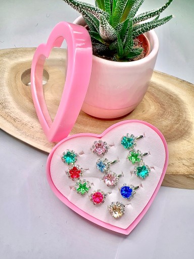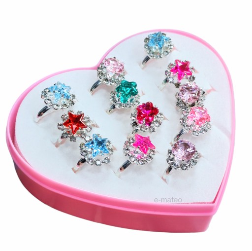 - 12 pierścionków z błyszczącymi elementami umieszczono w pudełeczku .