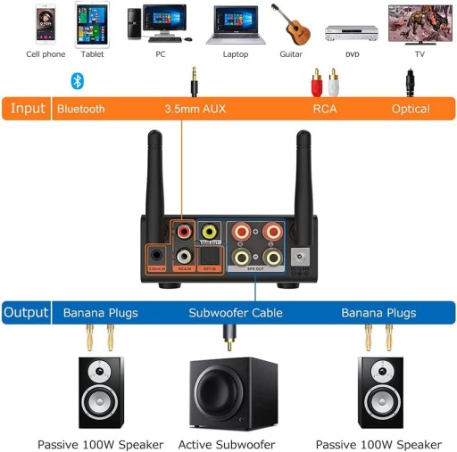 - Kompaktowy i mocny - 2.1-kanałowy cyfrowy wzmacniacz stereo Bluetooth. Ten mini-wzmacniacz Bluetooth może z łatwością napędzać pasywne głośniki 100Wx2 lub aktywny subwoofer.