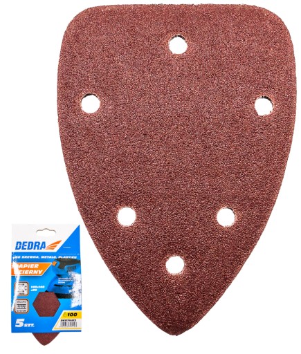 W zestawie znajduje się 5 sztuk papieru ściernego montowanego na rzep do szlifierki oscylacyjnej DEDRA DED7941. Stosuje się je do obróbki ściernej powierzchni przedmiotów wykonanych z takich materiałów jak drewno, metal, tworzywa sztuczne. Papier posiada otwory do systemu odsysania pyłów kompatybilne z wyżej wymienioną szlifierką.