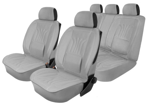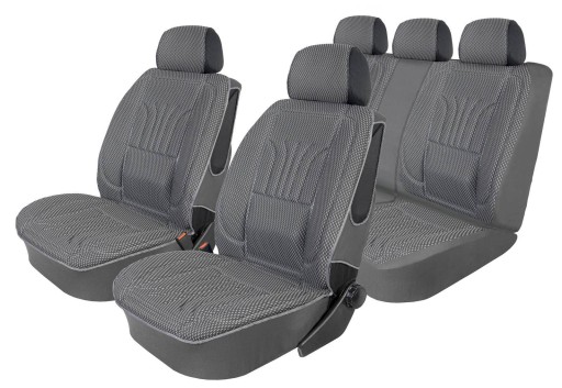 - Fotele przednie 2 pokrowce ergonomiczne "XL" rozmiar: 110 cm x 60 cm; tył oparcie i siedzisko z tłoczonym wzorem pokrowca ergonomicznego, dzielone 1/3 i 2/3 po dwa suwaki w elemencie; 5 zagłówków.