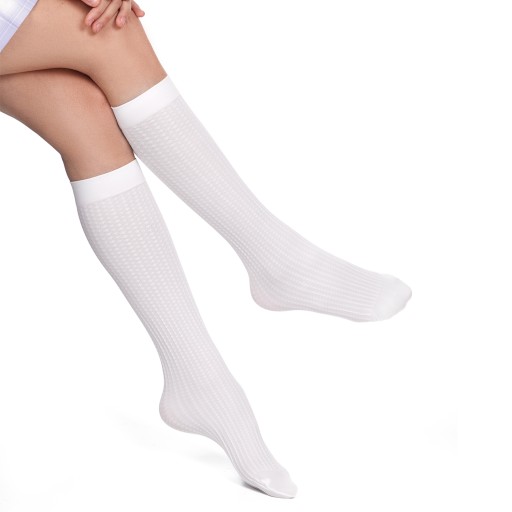 Podkolanówki są długości przed kolano i zostały wykończone nieuciskającym ściągaczem, który sprawia, że podkolanówki nie zsuwają się. Posiadają delikatną teksturę ozdobioną modnym, minimalistycznym wzorem. Zapewniają efektowny i atrakcyjny wygląd.
