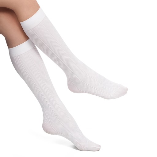 Podkolanówki są długości przed kolano i zostały wykończone nieuciskającym ściągaczem, który sprawia, że podkolanówki nie zsuwają się. Posiadają delikatną teksturę ozdobioną modnym, minimalistycznym wzorem. Zapewniają efektowny i atrakcyjny wygląd.