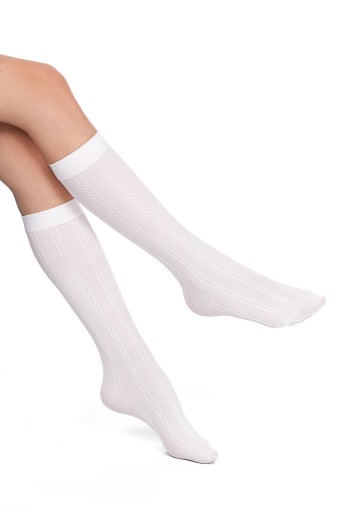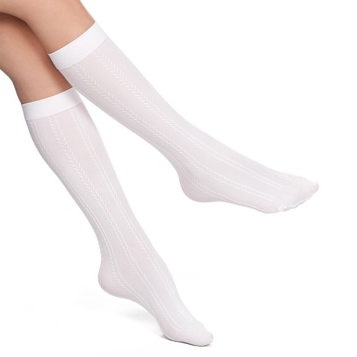 Podkolanówki są długości przed kolano i zostały wykończone nieuciskającym ściągaczem, który sprawia, że podkolanówki nie zsuwają się. Posiadają delikatną teksturę ozdobioną modnym, minimalistycznym wzorem. Zapewniają efektowny i atrakcyjny wygląd.